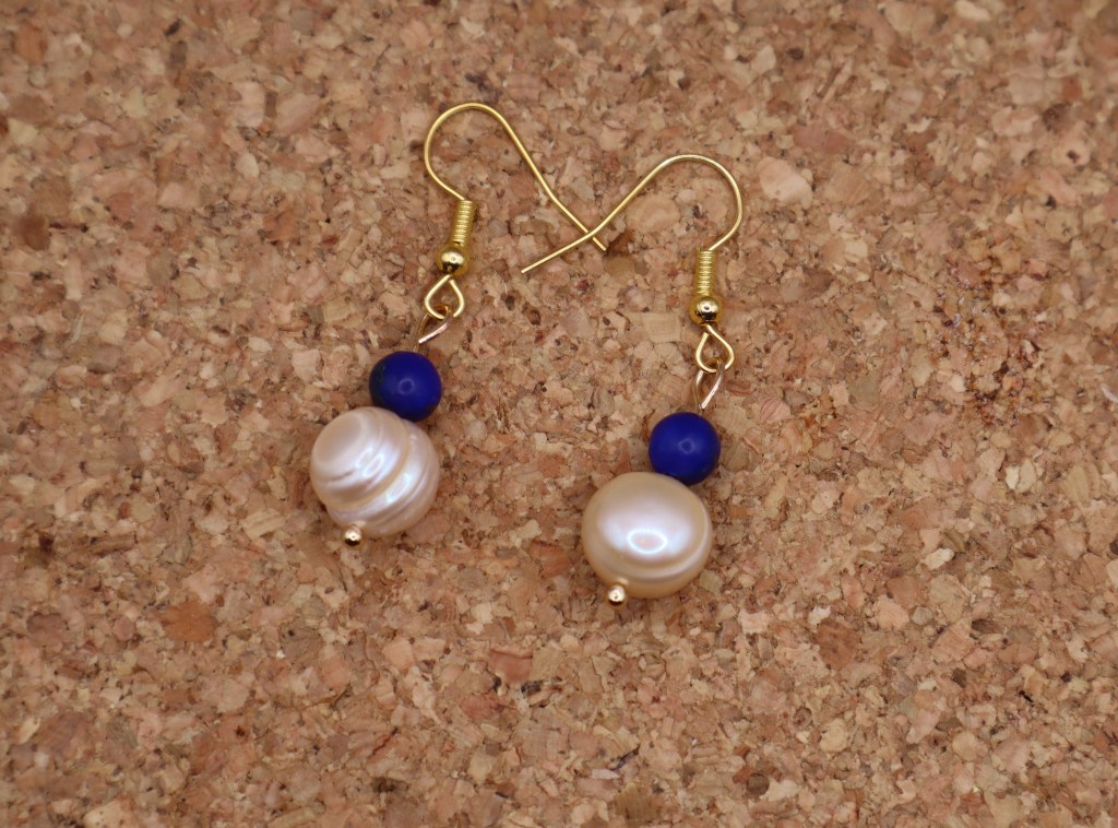 The earrings are completed with seawater pearls and small Lapis beads sitting on a gold cord with gold shvenza.