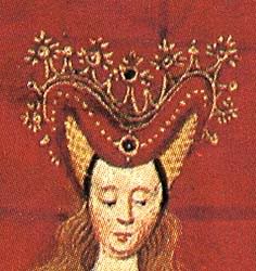 The presented accessory is the replica of the heart-shaped headdress accessory from the portrait of Margaret of Bavaria (1363 – January 1423, Dijon). She was the Duchess consort of Burgundy by marriage to John the Fearless, Duke of Burgundy. She was the regent of the Burgundian Low countries during the absence of her spouse in 1404–1419 and the regent in French Burgundy during the absence of her son in 1419–1423 (Huygens).