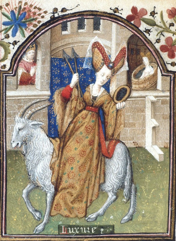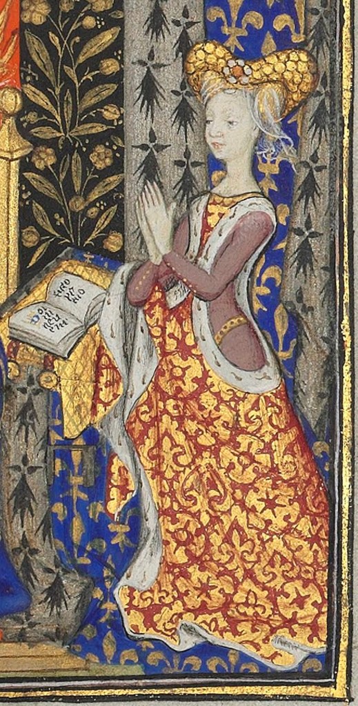 This style was mainly worn in Northern France, Burgundy, and the Low Countries. It was never a current trend in England, Italy, or Spain. Several aristocratic female figures of Northern France, Burgundy, and the Low Countries were depicted wearing the heart-shaped bourrelet, like Marguerite de Bavière, who was duchess consort of Burgundy and mother-in-law of Isabella of Portugal, Marguerite d’Orleans, Countess of Vertus (Northwest France). There are other contemporaneous artworks of this time, manuscripts with paintings, and a French Book of Hours, showing the same style of dress and head-dress worn by Isabella of Portugal and Margaret of Bavaria.