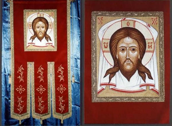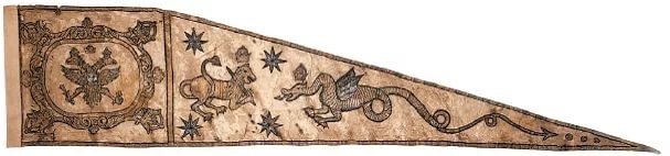 Russian banners of the sixteenth and seventeenth centuries were cut with a “scarf.” The rectangular part of the cloth was called the middle; its length was greater than the height; a rectangular triangle (slope) was sewn to the panel with its short side. The material for the Russian banners was kamka (Kamchatka, Kamchatka pattern; “tin tuft,” that is, shiny) – Chinese silk fabric with patterns, or thin taffeta – smooth silk fabric. On the military banner, holy image devices and passages of texts from the Gospel were embroidered with silver, gold, and colored threads. Along the edge of the banner was decorated with a border or fringe.