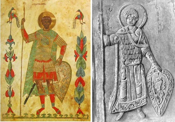 On the left is a miniature of the Fedorov Gospel, the border of the XIII-XIV centuries. On it is painted St. Fedor Stratilat. It was created in Yaroslavl, and it is still stored there.