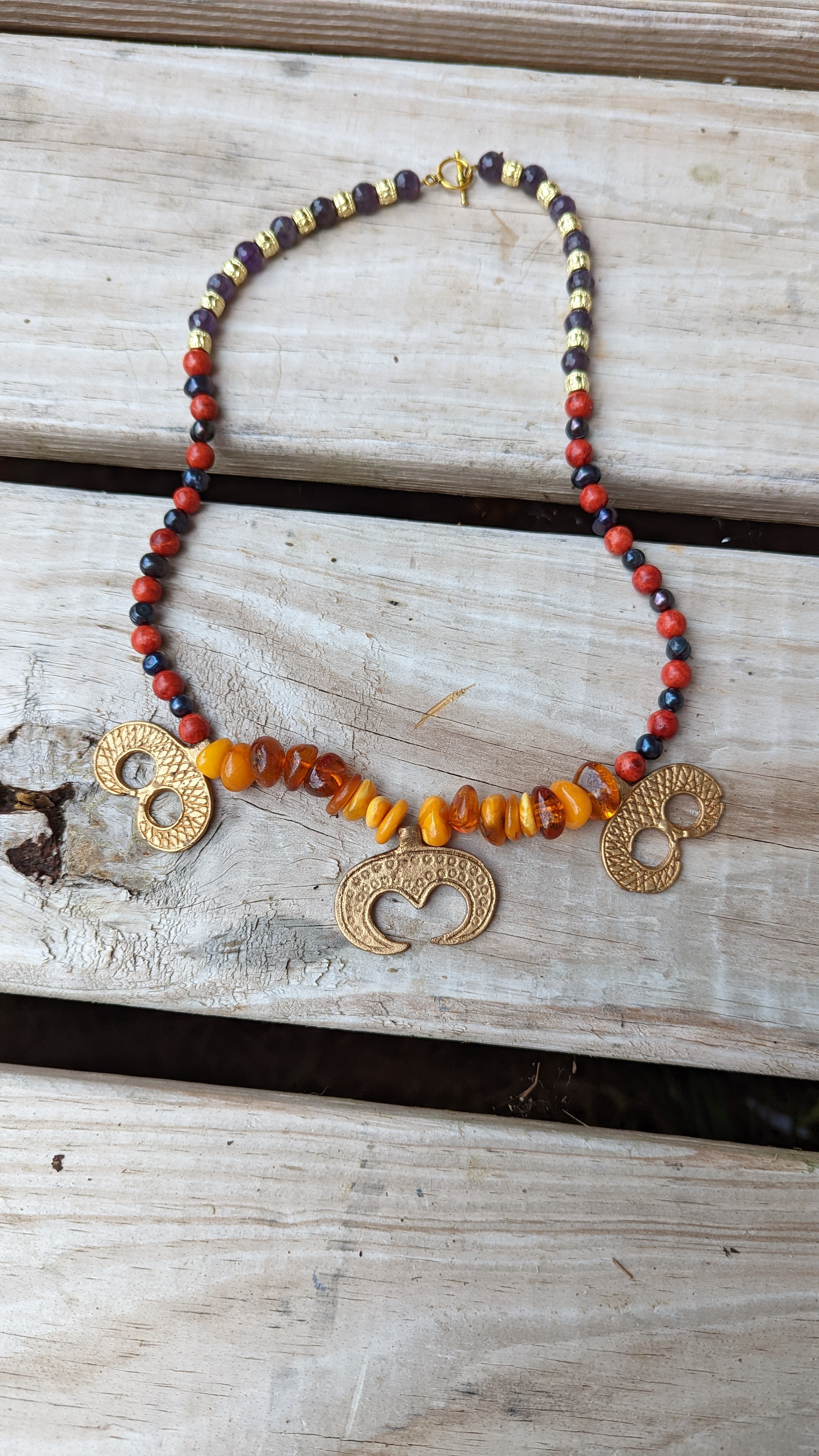 Some of the stones used in this necklace were selected due to the color selection. Those specific semiprecious stones were not located in the archeological findings but could have been bought from Byzantine and Arabic traders. The most commonly seen on the Eastern Slavs’ territory Slavs are Amber, Mountain cristal, Agate, carnelian, lapis, coral, etc.