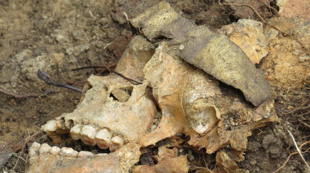 Birch bark is found in the burial as a supporting material for the neckline. Approx. XII century.