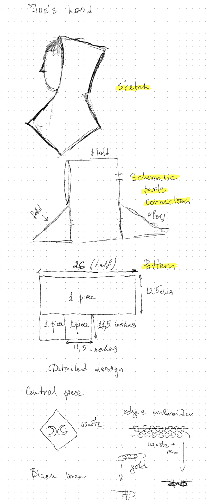 Before cutting them from the fabric, I sketched the progress and how the pieces shall align. I have used black 100% linen in both cases.
