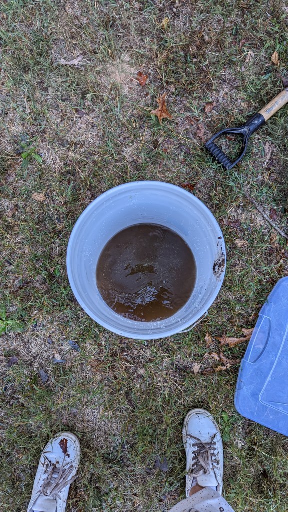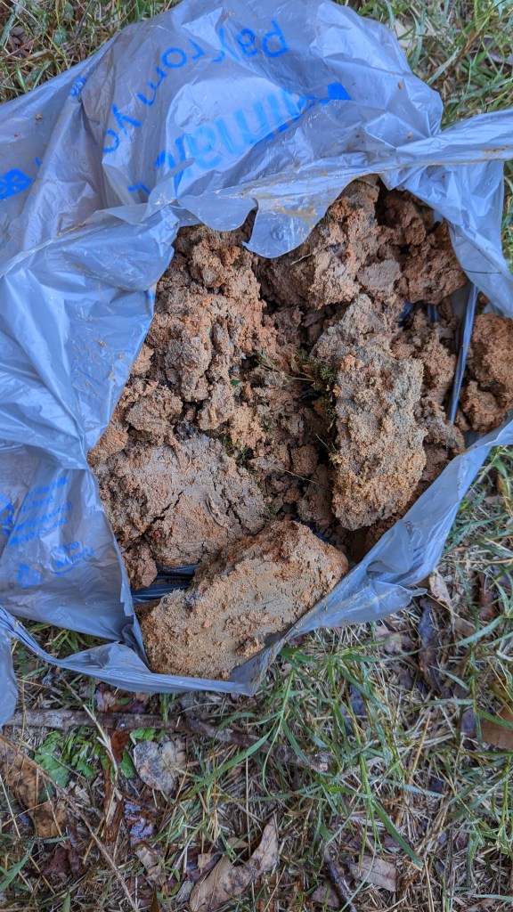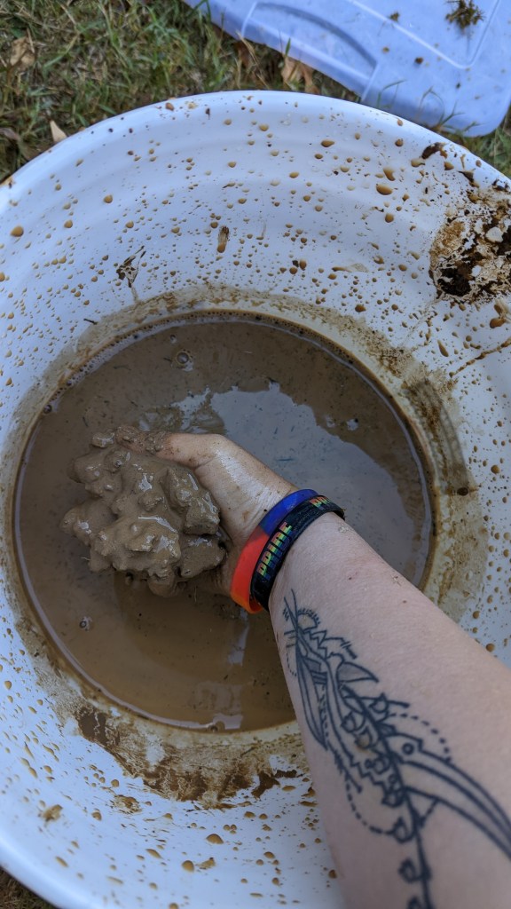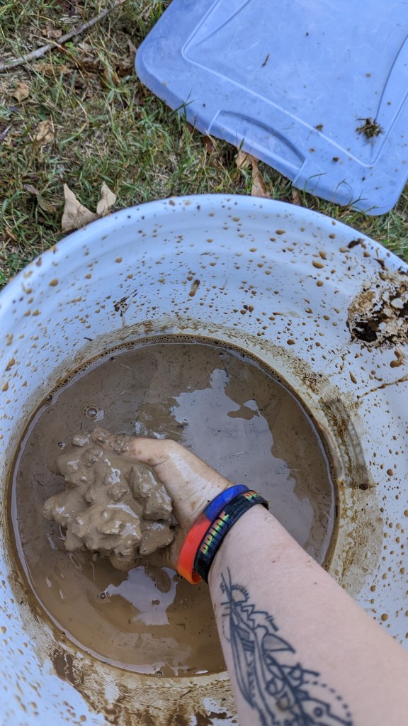 After all, the clay was broken apart, and I left the bucket to settle. Later in the day, I used a fire pit top as a griddle to run the clay through it to remove the last sand.