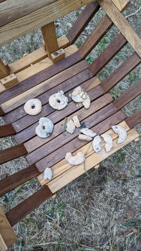 Once the clay was soft but not soaking wet, I started making the “bagels” and distributed them on the same wood piece I used to dry. After that, I prepared the fire pit and started the fire.