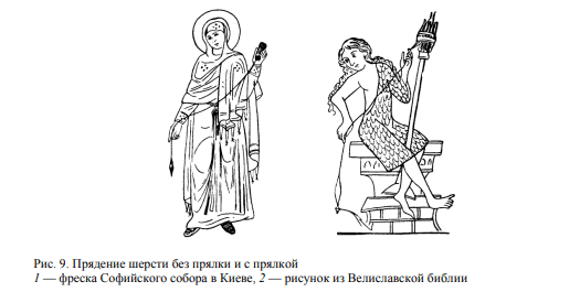 Wool spinning with and without a stuff. 1 – fresco from Sofia Church in Kyiv, 2 – picture from Velislav’s bible.