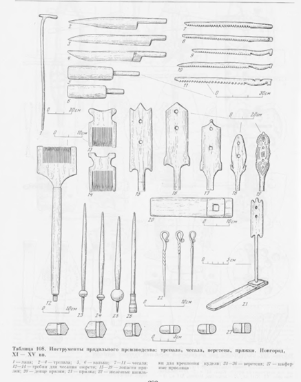 Tools of textile production. Pic. 23-26 are the spindle rods; pic 27 is the clay for the spindle. XI-XV century.