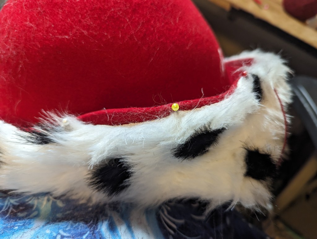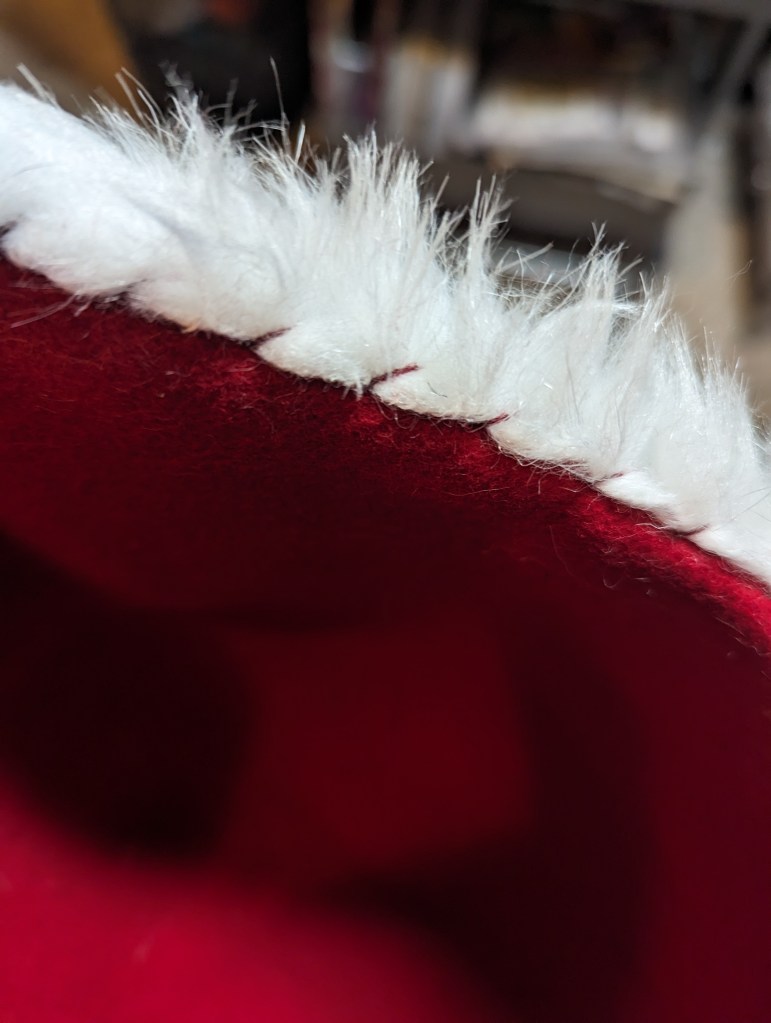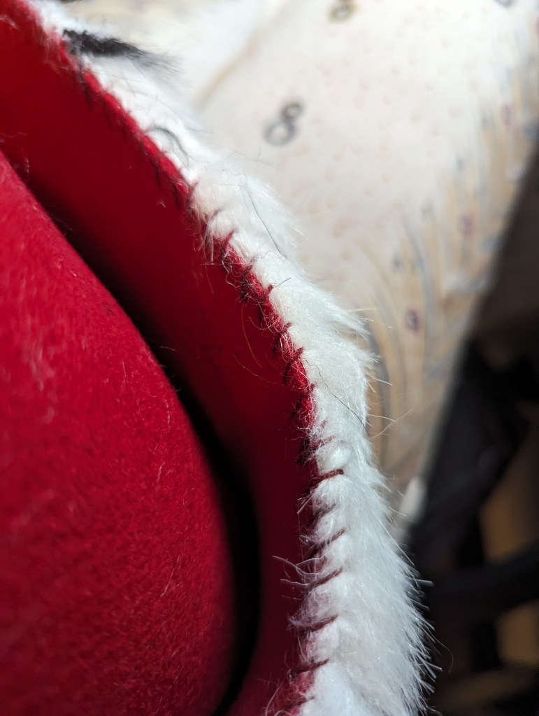 Now, to attach the fur to the hat. I pierced the wool hat and, using the same whipping stitch and matching wool thread, sewed it on the top and the bottom of the hat edge. I also used pins to fix the fur to teh hat and started from the back. Once I sew one side I cut extra fur and sew another side.