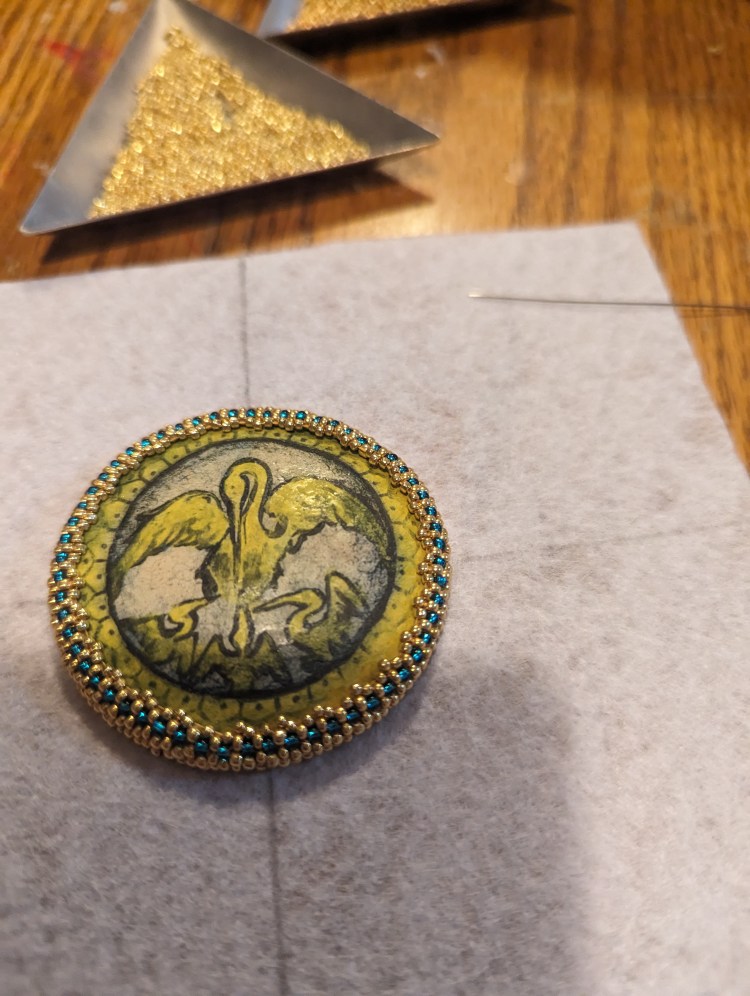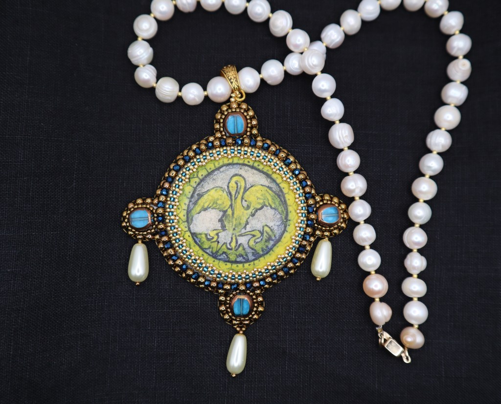 I used to replicate metal work with beads, but my main problem was finding that central piece that was light enough, had a pelican picture or engraving, and wouldn’t get lost in the bead shine. I asked my friend, Baronka Ingegerd Kastanrazi, a talented potter, to help me with this task. She agreed to design a cabochon based on an Early 16th-century Maiolica Glazed and lustered Platter created at the School for Maiolica in DeRuta, Italy, using period recipes for the glass. The result was astonishing.