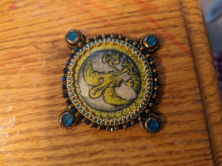 I received two cabochons made in different designs and decided to go with the left one because the edging could be beautifully aligned with the beads’ edge, and the color scheme looked a little better compared to the gold beads.