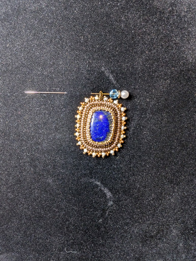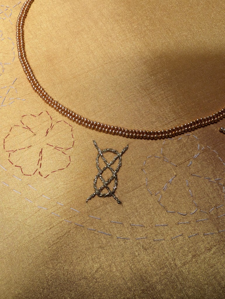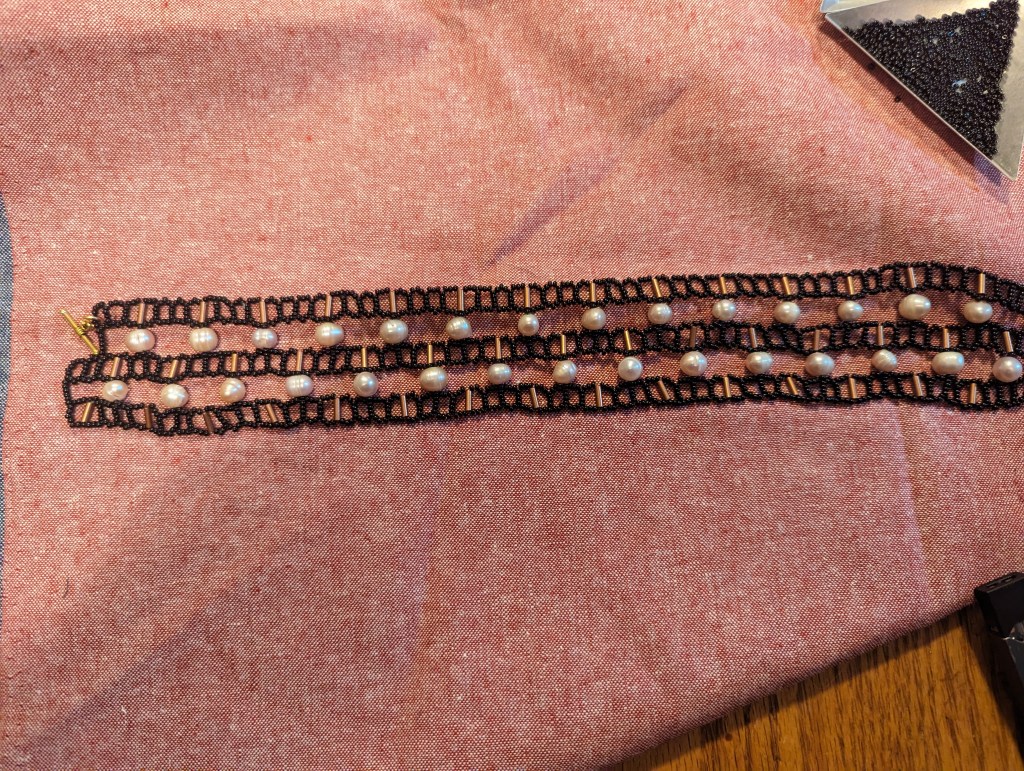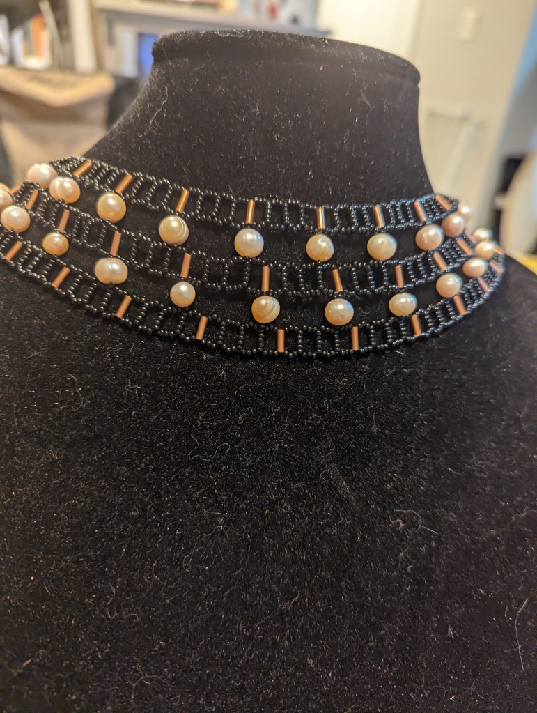 Materials used were glass beads (black, size 11/0 and 15/0) and steelarius tubes with bronze covers, saltwater pearls, silk thread, and gold accessories.
