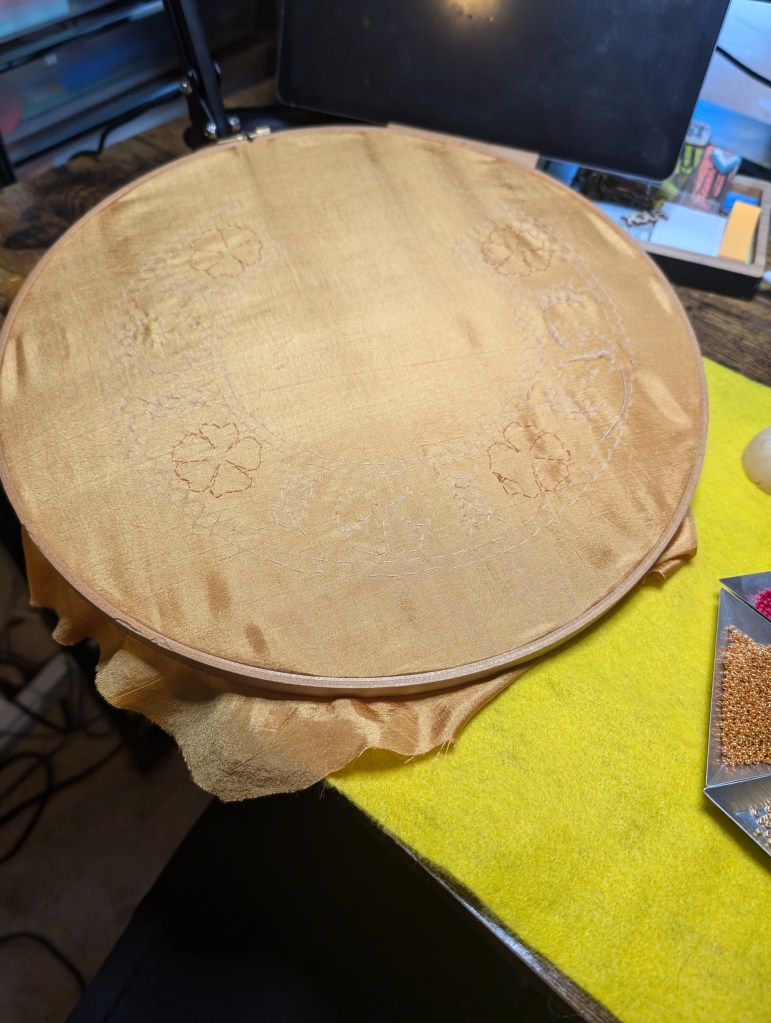 One slight problem was ahead of me. As I learned here, silk and sticky paper do not work well together. Instead, I tried this: I stitched the outline with a constant thread, then removed the paper, and went from there.