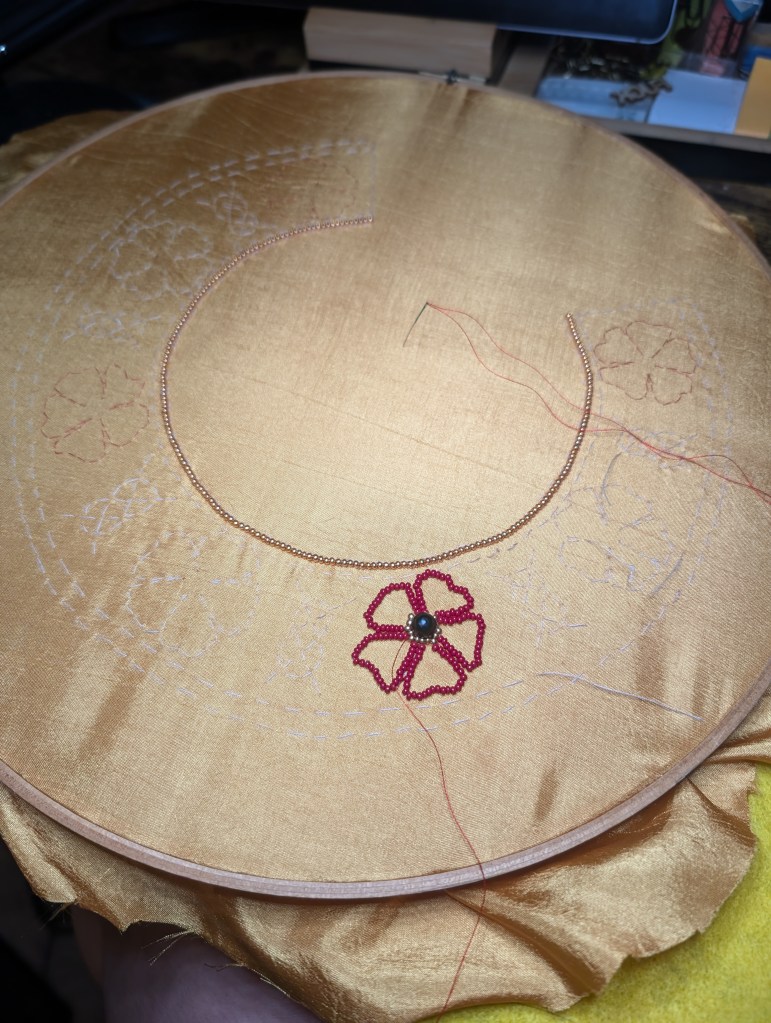 Then, I embroidered each rose, filling them from the borders inside. This was the moment I decided to learn tambour embroidery (more about this journey later).