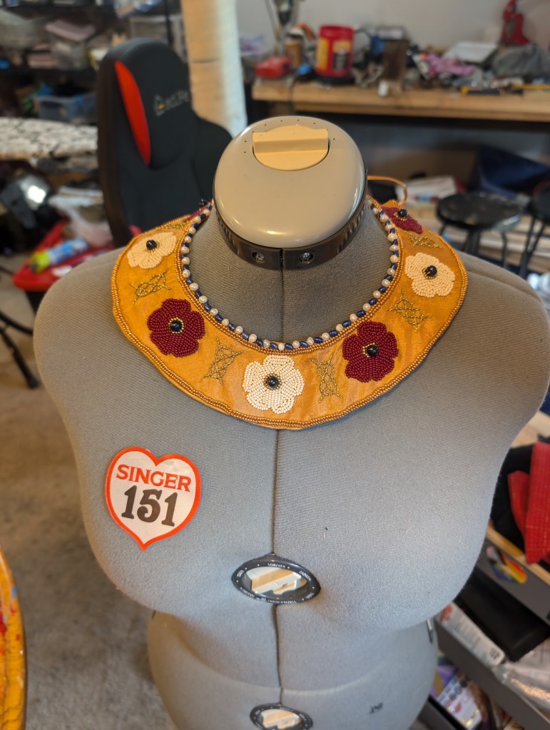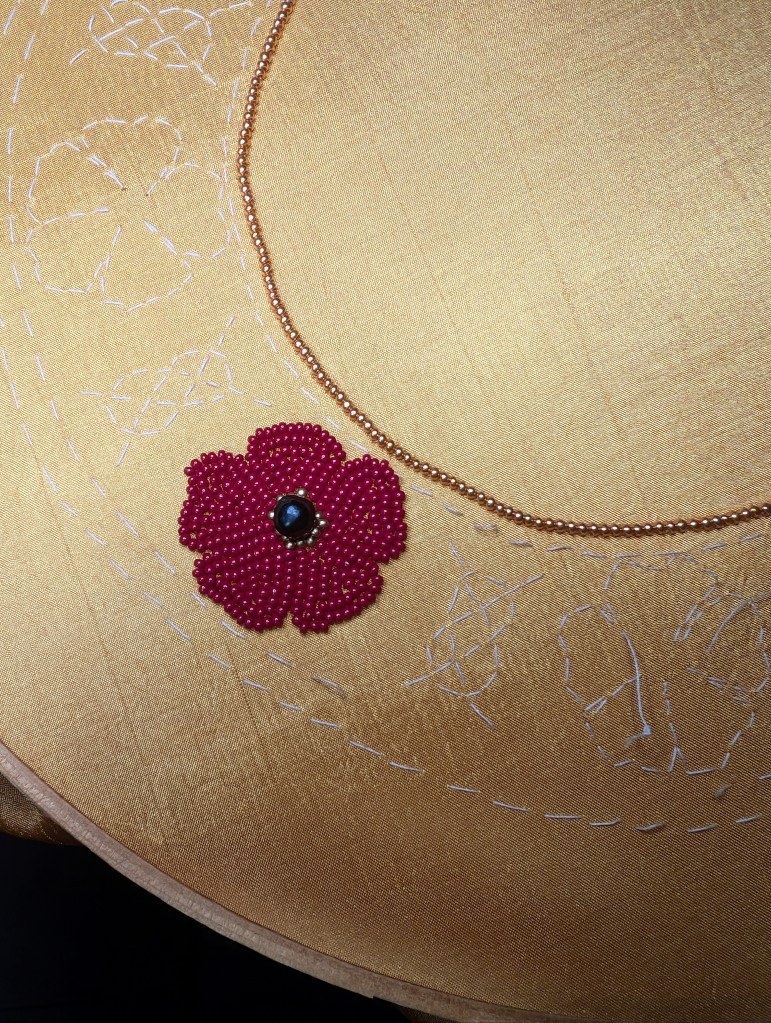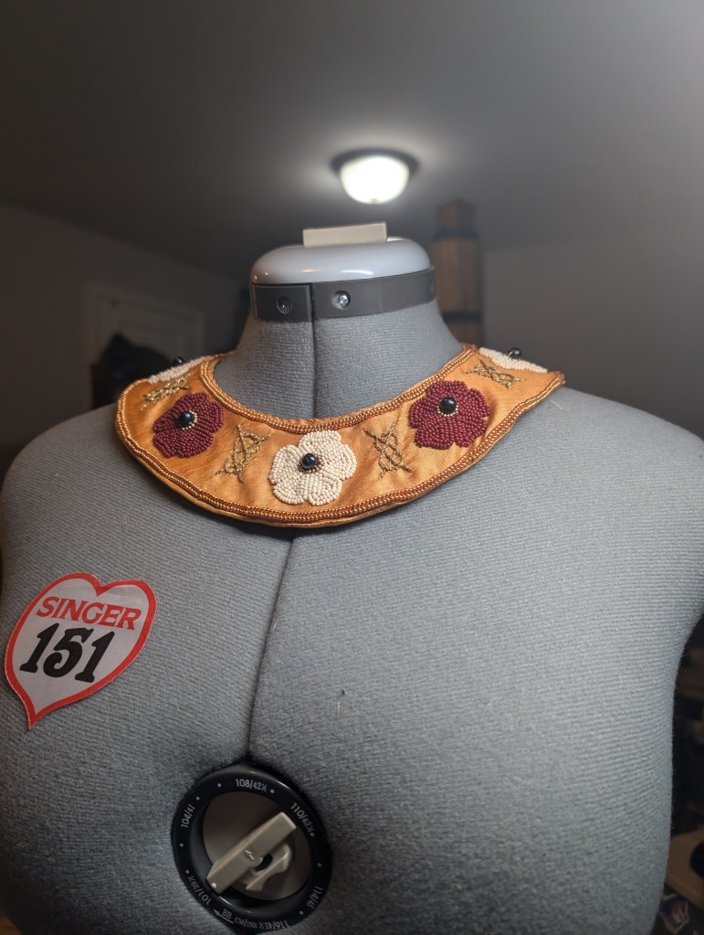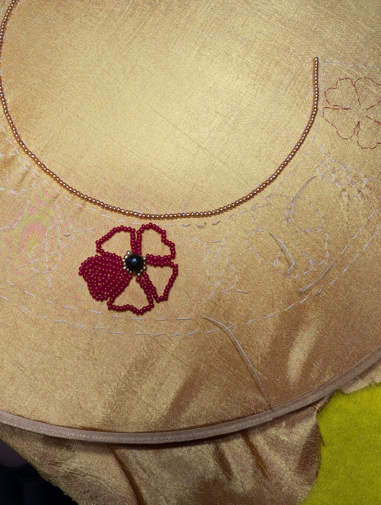 Once completed, I stitched two pieces of silk together to make a “case” and put a piece of leather inside so the necklace would hold its form. All of this was done with silk thread, on silk, so there was a lot of remaking there as well.